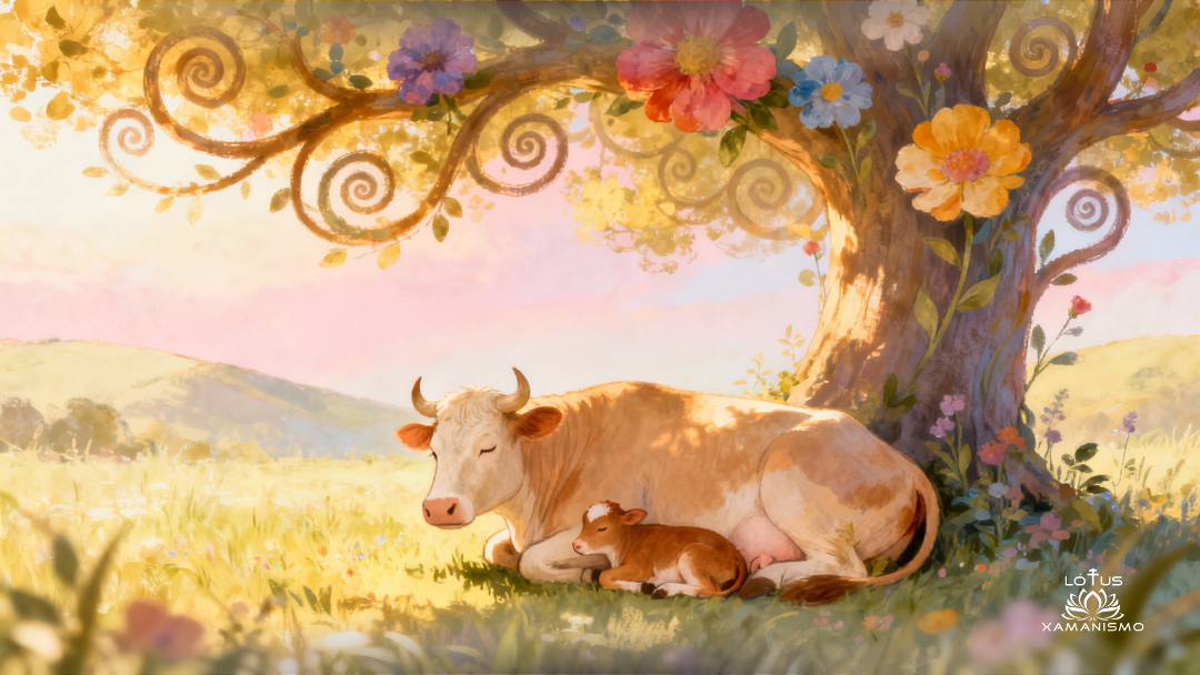 A Vaca devolve a pessoa ao ventre primordial da existência, àquele berço onde tudo é possível porque tudo é nutrido com paciência infinita e Amor constante. Sua presença marca o início de um novo ciclo: um ciclo de cura profunda, de estabilidade enraizada, de nutrição amorosa e de respeito genuíno pela própria jornada. É um retorno ao que sempre foi verdadeiro, ao que sempre esteve esperando ser reconhecido.